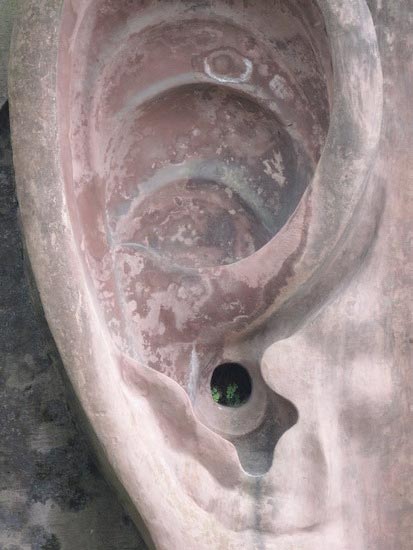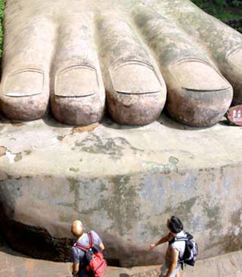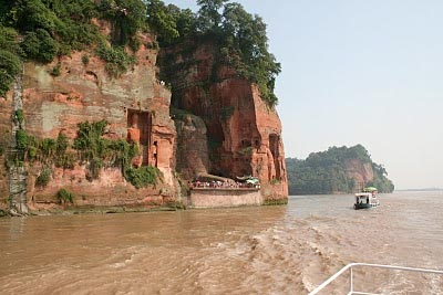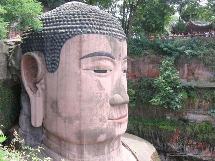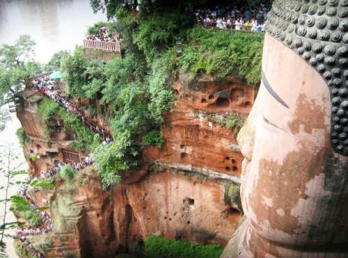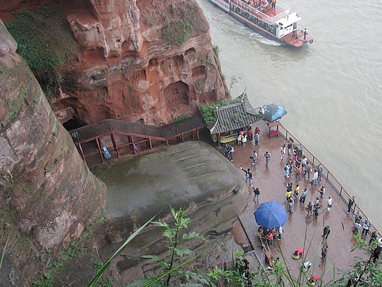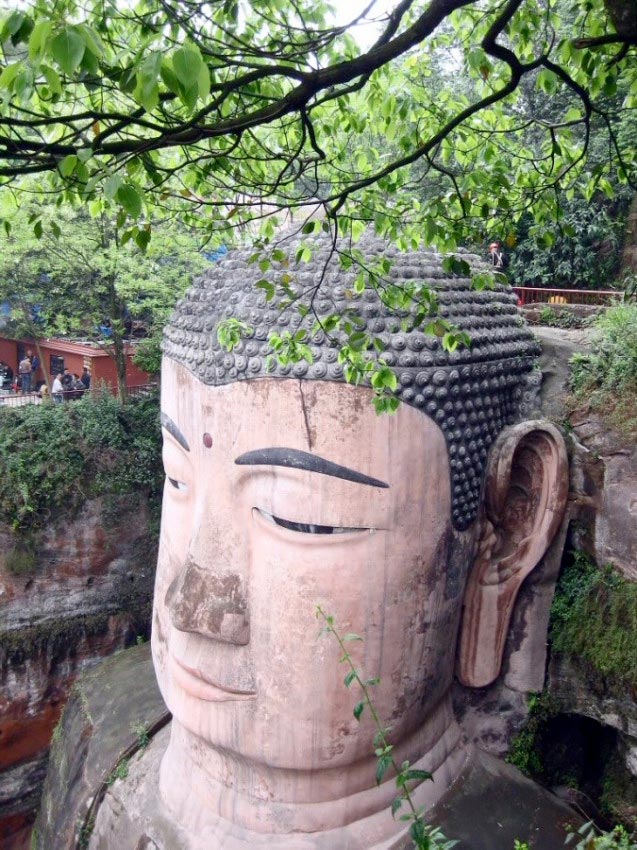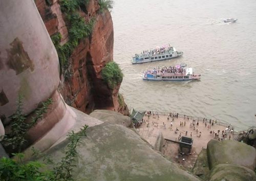 Las vistas desde los pies del Buda son igualmente imponentes, ya que la figura se alza majestuosa sobrecogiendo a cualquier espectador. También podemos montar en un ferry para ver una vista panorámica del Buda desde el río. Existe un dicho en la zona que reza así: “La montaña revela al Buda y el Buda esconde la montaña”. Esto se corresponde con la vista que podemos ver cuando navegamos por el rio, con la imagen de la montaña y el Buda en su corazón durmiendo apaciblemente.