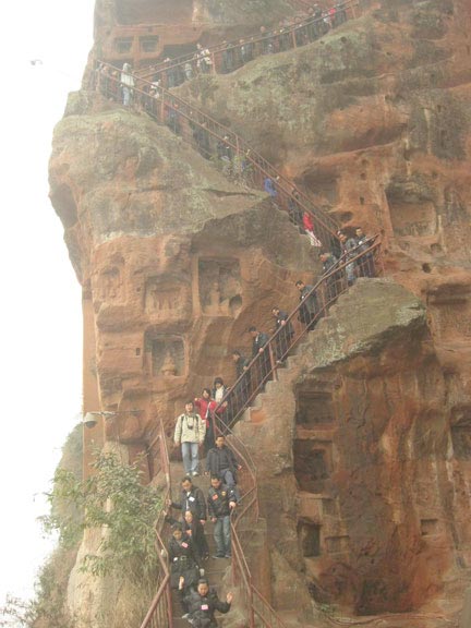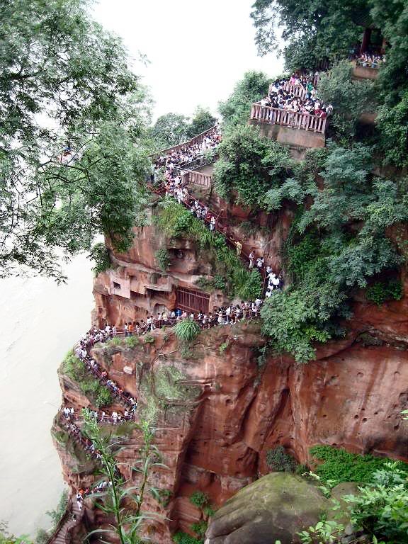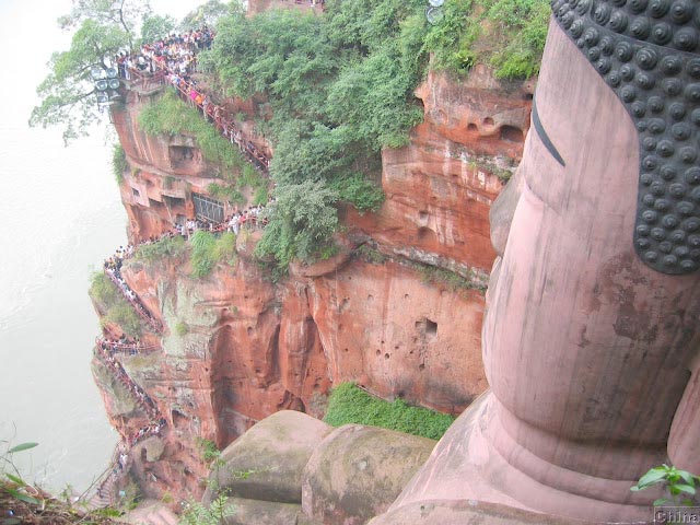 Si quieres admirar de cerca esta estatua, puedes recorrer una impresionante plataforma de madera situada a un lado del acantilado. A la derecha del Buda, existe un corredor escarpado de 250 escalones, que serpentea nueve veces en forma de zigzag. Este es el famoso pasillo de las nueve vueltas, no apto para los que sufren de vértigo.