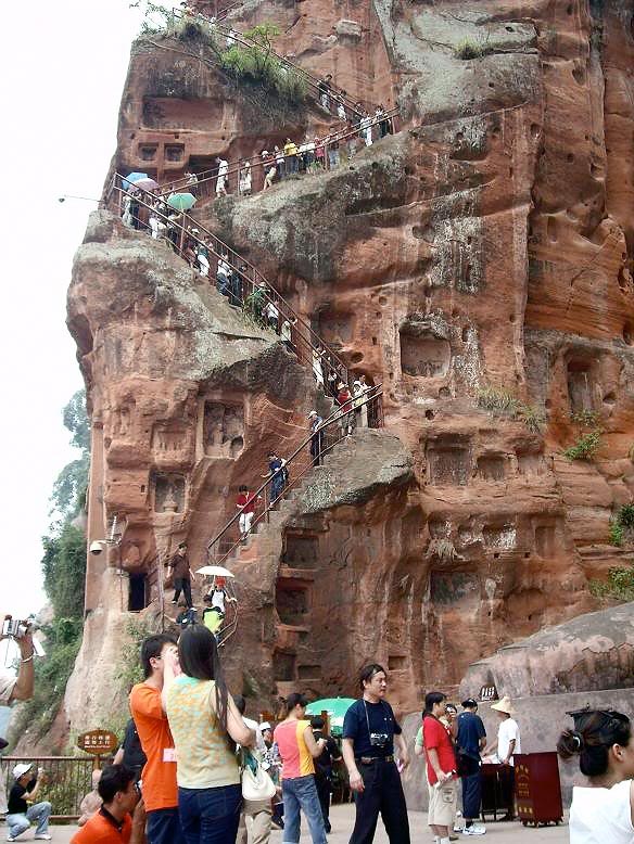 En la parte superior del acantilado, a la altura de la cabeza del Buda, existe una galería en la que los turistas pueden relajarse y apreciar los detalles de la cabeza. Al lado de los caminos del acantilado existen dos notables estatuas, talladas en la dinastía Tang. Los turistas también pueden observar sugestivas figuras de hadas, pabellones y pagodas, grabadas con meticulosos detalles y diseños que ilustran la sofisticación y la pericia del tallado que se efectuaba durante la dinastía Tang.